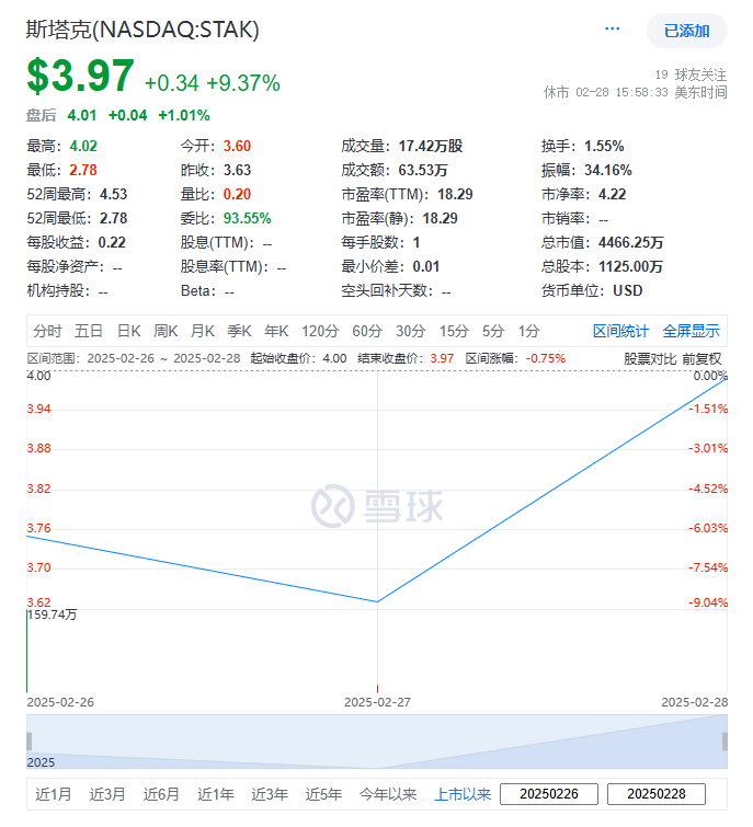 截至2025年2月28日收市,斯塔克(STAK)每股收报3.97美元,较IPO发行价稍跌0.75%,目前市值约4,466.25万美元。
