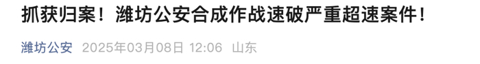 3月7日,潍坊市公安局依托侦查中心合成作战机制,快速侦破一起在公共道路驾驶车辆严重超速案件,从接到群众举报到抓获犯罪嫌疑人仅用4小时,彰显了公安机关对交通违法行为“零容忍”的执法决心与科技强警的高效战斗力。