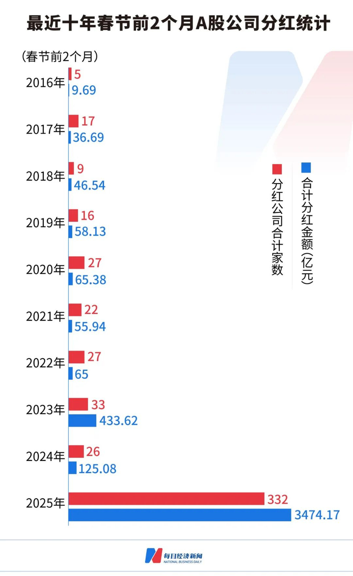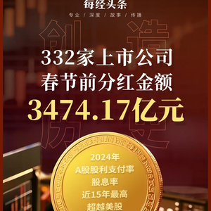 《每日经济新闻》记者据Wind数据统计,在2024年11月27日至2025年1月27日这短短两个月内,A股市场上演了一场盛大的“红包雨”!共有332家上市公司慷慨解囊,现金分红金额高达3474.17亿元,成为历年春节前分红最多的年份。