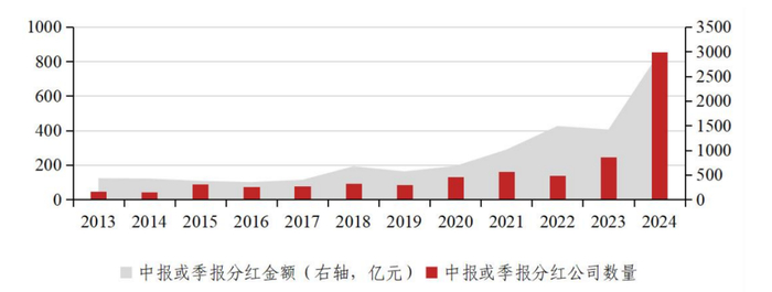 据统计,2024年,有855家上市公司进行了中报或季报分红,同比增长2.5倍,其中742家上市公司年内分红次数两次以上,同比增长4.2倍,占分红公司的比例达到19%。A股中报或季报分红总额2981亿元,较上年增长1倍以上,占全年整体分红总额的比例提升至15%,已成为境内上市公司分红的重要组成部分。