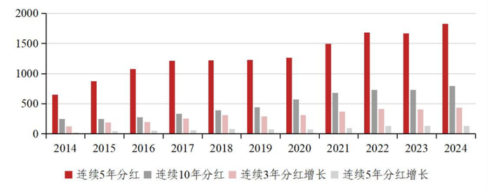 此外,实现连续数年分红的上市公司数量也在持续增加。据《报告》统计,2024年,连续五年分红的上市公司超过1800家,占上市满五年的上市公司数量40%,更有近800家上市公司连续十年分红,占比约28%;分红增长性方面,连续3年、连续5年分红增长公司数量达到400家、130家,占比9%、3%。