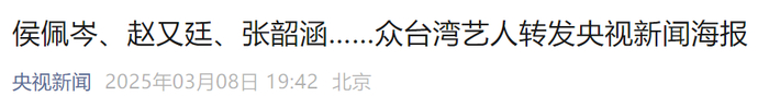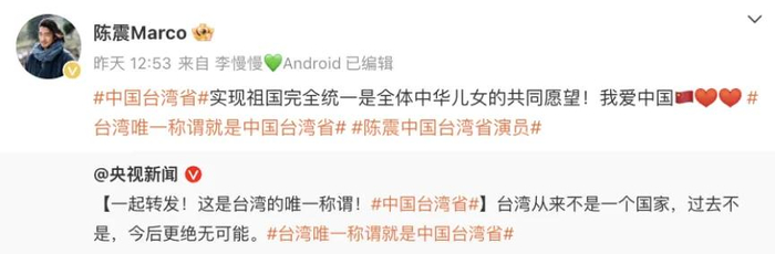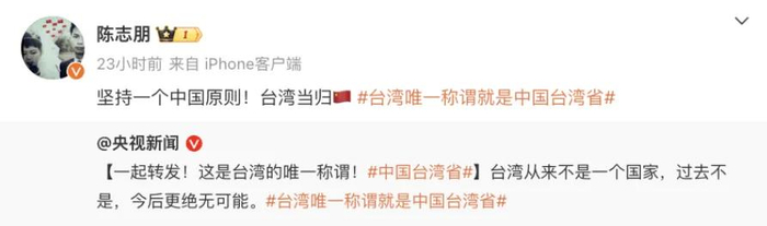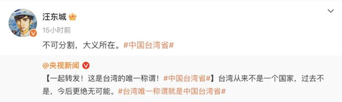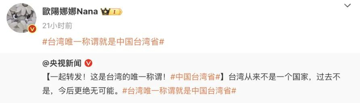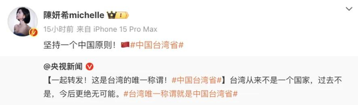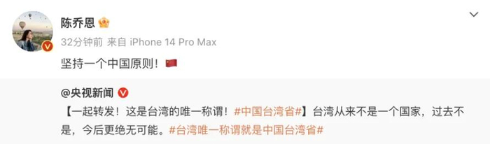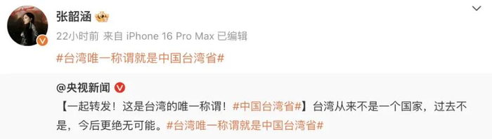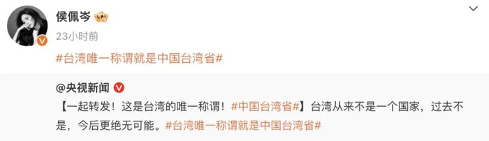 侯佩岑、赵又廷、张韶涵……众台湾艺人带#中国台湾省话题转发