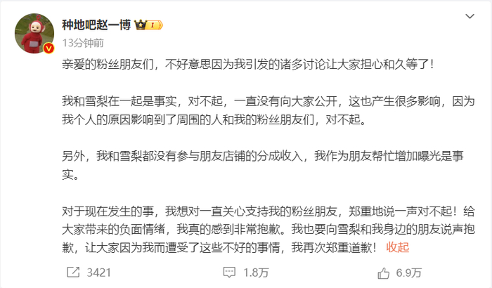 3月7日,赵一博通过微博发文,坦诚地承认了与网红 “雪梨大王” 的恋情,直言 “我和雪梨在一起是事实” 。同时,他就此前未公开恋情、未及时回应争议,向粉丝及相关当事人诚恳致歉。