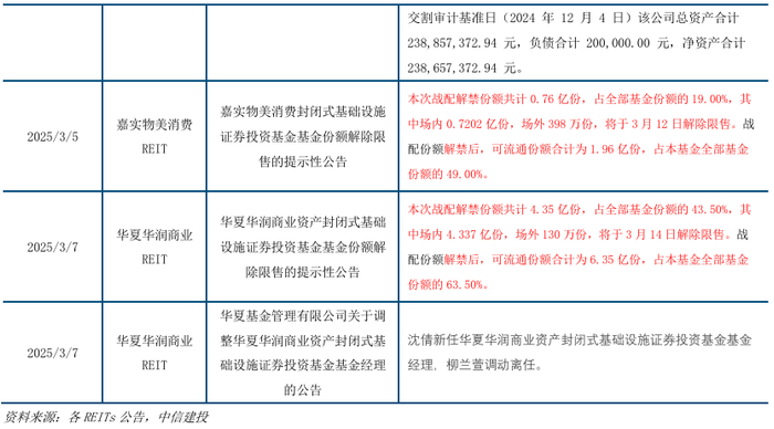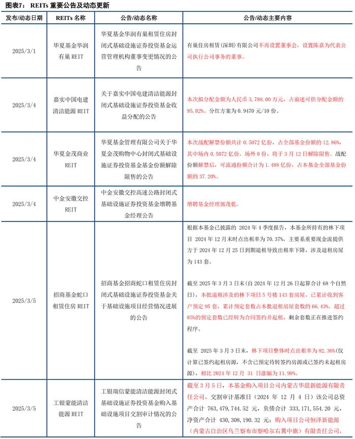重要公告回顾:1)华夏基金华润有巢REIT:设置陈嘉为代表公司执行公司事务的董事;2)嘉实中国电建清洁能源REIT:本次拟分配金额为人民币3,788.00万元;3)华夏金茂商业REIT:解禁份额共计0.5亿份,3月12日解除限售;4)中金安徽交控REIT:增聘基金经理郭茂乾;5)招商基金蛇口租赁住房REIT:截至 2025年3月3日末,林下项目整体时点出租率为82.36%,相比2024年12月 31 日涨幅为11.99%;6)工银蒙能清洁能源REIT:购入项目公司内蒙古华晨新能源有限责任公司、恒泽新能源(内蒙古自治区乌兰察布市察哈尔右翼中旗)有限责任公司;7)嘉实物美消费REIT:解禁份额共计0.76亿份,3月12日解除限售;8)华夏华润商业REIT:解禁份额共计0.5亿份,3月14日解除限售; 沈倩新任华夏华润商业资产封闭式基础设施证券投资基金基金经理,柳兰萱调动离任。