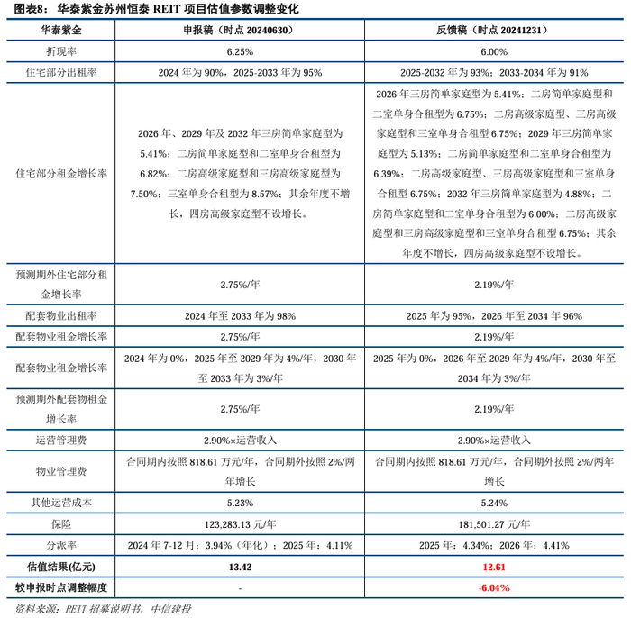 华夏北京保障房中心REIT和华泰紫金苏州恒泰REIT分别于3月4日、3月6日回复反馈,估值较申报稿分别下调6.04%、0.24%。华夏北京保障房中心REIT主要调整出租率这一关键估值参数,底层资产估值下调至8.29亿元,较申报稿下降0.02亿元。华泰紫金REIT主要调整出租率、折现率、租金增长率等关键估值参数,底层资产估值下调至12.61亿元,较申报稿下降0.81亿元。