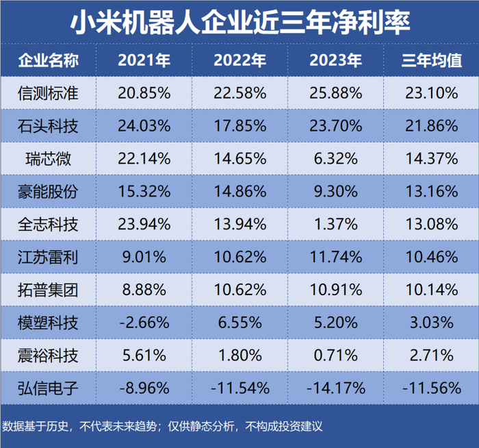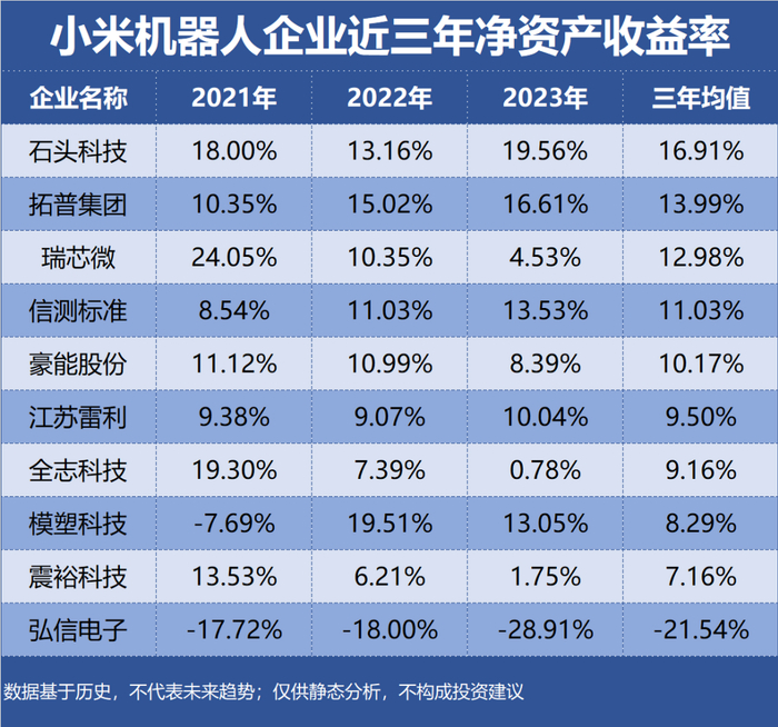 小米机器人盈利能力前十企业,近三年净资产收益率、毛利率、净利率: