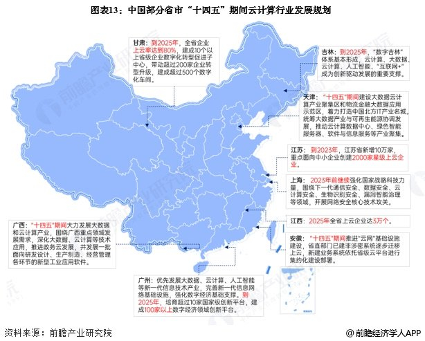 从各省市的云计算发展规划来看,目前我国云计算基础设施配套完善,云计算技术有大幅跃升,企业上云率有明显提高。“十四五”期间,各省市将继续推动大数据与云计算产业的发展,同时提升云计算对经济发展的支持能力。
