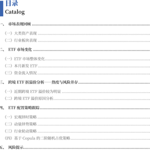 ETF策略表现:宏观择时策略:我们改良美林投资时钟并将其应用于大类资产配置,以ETF作为投资标的构建可交易的ETF宏观择时策略。我们构建经济指数与流动性指数,并将经济状态划分为四个周期。2025年2月基于Gaussian分布的模型策略实现收益率1.04%,基于Copula分布的模型策略实现收益率0.99%。动量择势策略:ETF动量择势策略使用XGBoost预测出的ETF上涨概率作为动量指标,以基金份额历史分位数代表拥挤度,选择动量排名前20且(1-拥挤度分位数)排名前20的板块,最后选择板块内动量最大的ETF。2025年2月,基于动量和拥挤度构建的动量择势ETF策略实现收益率8.95%。低波扩散行业轮动策略:基于低波扩散行业轮动模型,并将模型结果应用在ETF配置。每期选出6个中信一级行业对应ETF进行等权配置,2月行业轮动策略实现收益率-0.78%。二阶随机占优策略:每个月根据资金流向等指标对行业进行打分,通过Copula模型及二阶随机占优积分条件为约束条件,优化计算ETF持仓权重,策略在2月收益率为-0.14%。