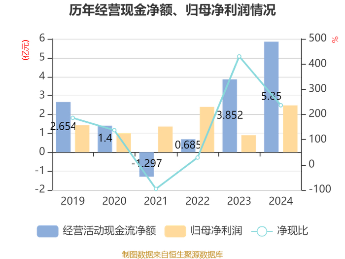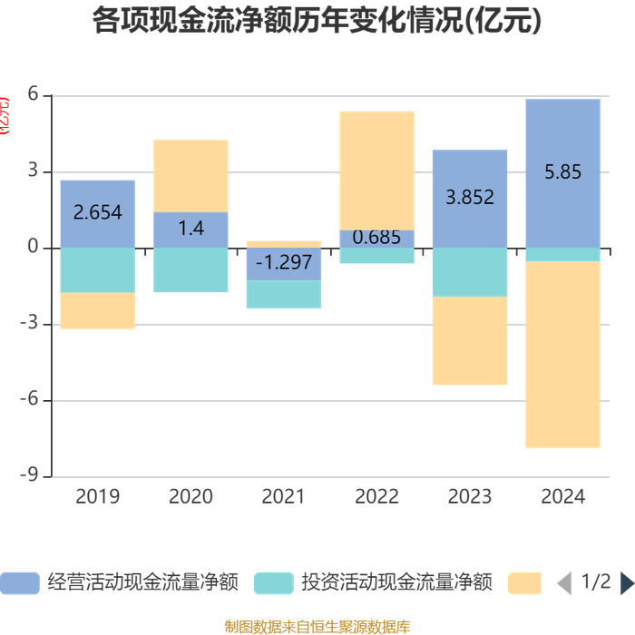截至2024年,公司经营活动现金流净额为5.85亿元,同比增长51.85%;筹资活动现金流净额-7.34亿元,同比减少3.88亿元;投资活动现金流净额-5438.94万元,上年同期为-1.93亿元。