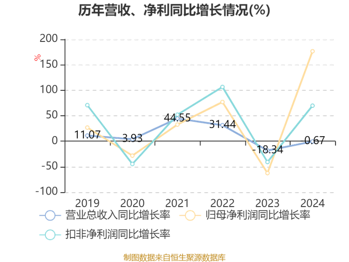 中证智能财讯英洛华(000795)3月8日披露2024年年度报告。2024年,公司实现营业总收入40.09亿元,同比下降0.67%;归母净利润2.48亿元,同比增长176.52%;扣非净利润2.13亿元,同比增长69.61%;经营活动产生的现金流量净额为5.85亿元,同比增长51.85%;报告期内,英洛华基本每股收益为0.2238元,加权平均净资产收益率为9.10%。公司2024年度分配预案为:拟向全体股东每10股派现1.24元(含税)。