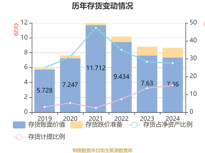 从存货变动来看,截至2024年末,公司存货账面价值为7.36亿元,占净资产的27.38%,较上年末减少2701.87万元。其中,存货跌价准备为1.3亿元,计提比例为15.01%。