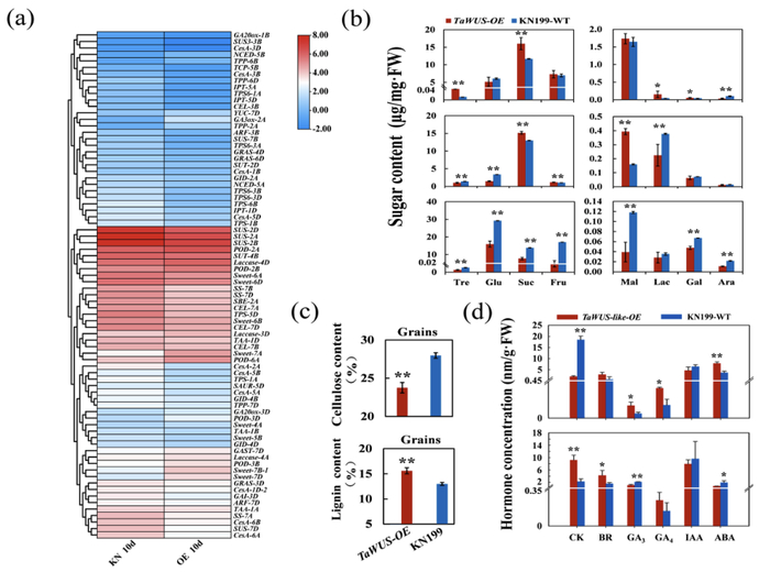 图4TaWUS-like-5D下游调控基因的转录组分析(a)及转基因过表达(OE)株系中籽粒糖含量(b)和激素含量(d)的测定
