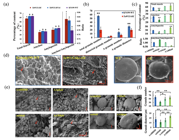 研究发现,TaWUS-like-5D过表达株系中的总淀粉、直链淀粉以及支链淀粉含量均下降明显(图3a,P < 0.01),籽粒影像特征显示过表达株系中的淀粉颗粒堆积松散,邹缩严重籽粒内部有较大空腔,显示淀粉填充的明显不足;A型淀粉粒的数量和直径,与野生型对照比,均显著减少和变小(图3b,3d;P < 0.05和P < 0.01);而CRISPR基因敲除突变体(AABBdd)中的淀粉含量则增加明显(图3c),A型淀粉粒填充饱满、籽粒直径明显变大(图3e,3f;P < 0.01),证实了TaWUS-like-5D影响了小麦籽粒中的淀粉合成和灌浆。进一步的研究发现TaWUS-like-5D可能主要通过抑制蔗糖裂解、运输、T6P糖信号及激素合成相关基因的转录(图4a,4d)而影响了蔗糖向淀粉的转化和利用(图4b),进而降低了籽粒的灌浆,引起了籽粒TKW和产量的显著下降(图5模式图)。