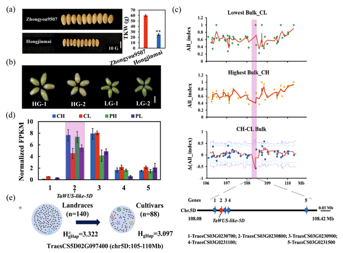 图1 TaWUS-like-5D基因的BSA定位克隆和鉴定(a, b, c, d)以及基因单倍型的育种进化分析(e)