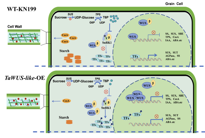 近年来,T6P调控主要谷类作物产量的潜在作用引起了人们广泛的关注(Liu et al.,2023,PBJ)。但关于T6P如何在小麦籽粒中应答蔗糖信号、并参与蔗糖代谢、调控作物产量性状形成的分子作用机理目前尚不十分清楚。该团队通过转基因过表达、RNAi介导的干扰沉默和CRISPR/Cas9介导的基因敲除突变技术、RNA-seq以及结合籽粒中糖、淀粉及激素含量测定等生理生化方法,系统研究了TaWUS-like-5D在小麦籽粒发育和蔗糖调控中的重要作用。