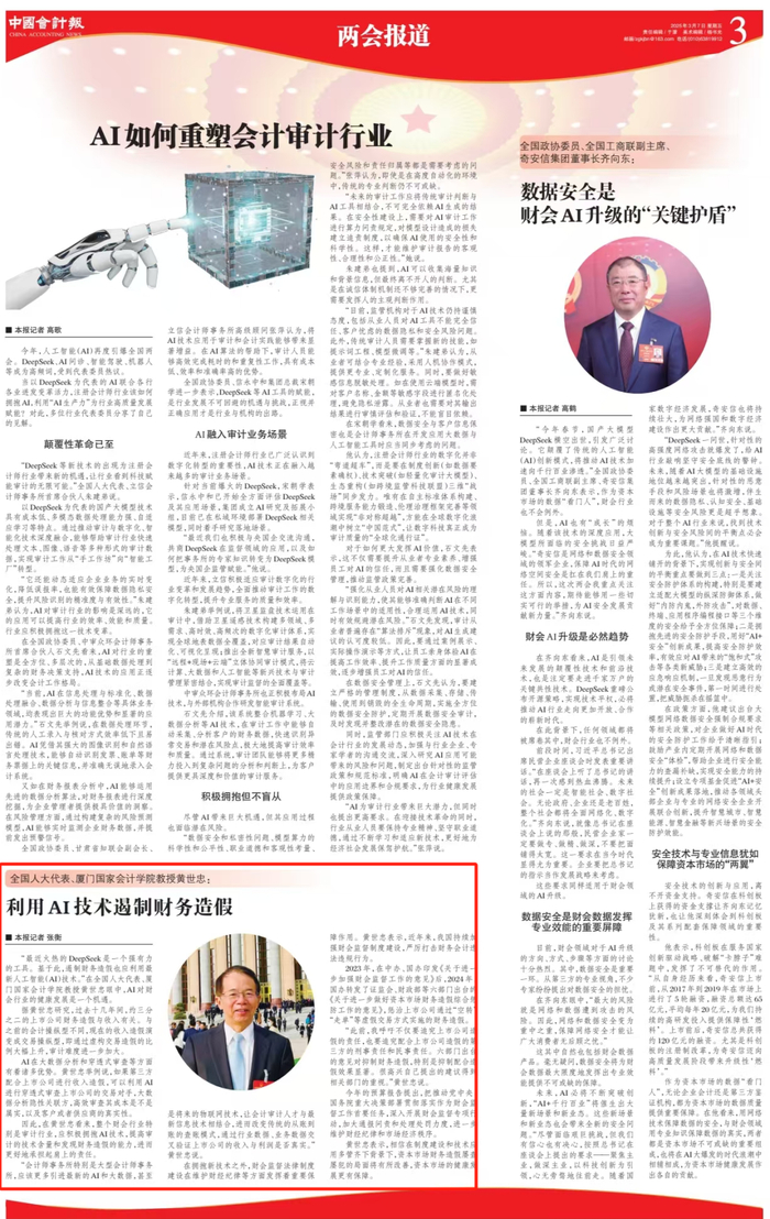 “最近火热的DeepSeek是一个强有力的工具。基于此,遏制财务造假也应利用最新人工智能(AI)技术。”在全国人大代表、厦门国家会计学院教授黄世忠眼中,AI对财会行业的健康发展是一个机遇。