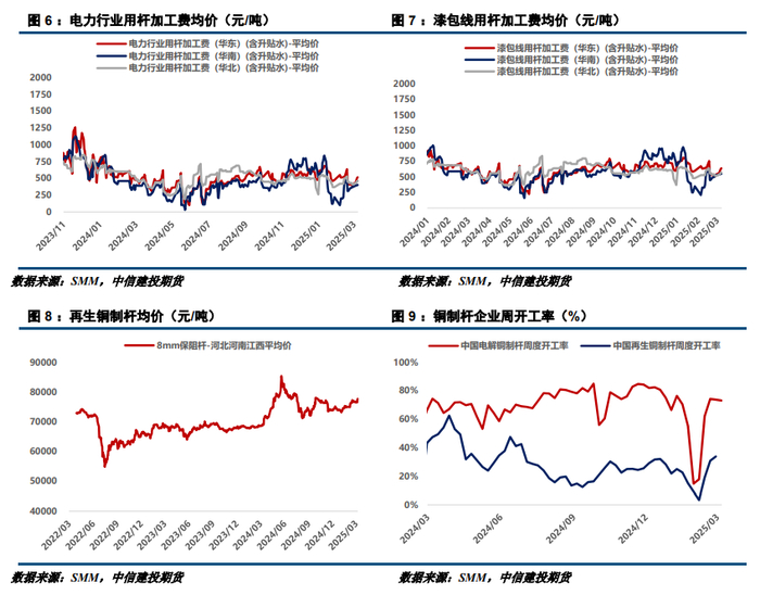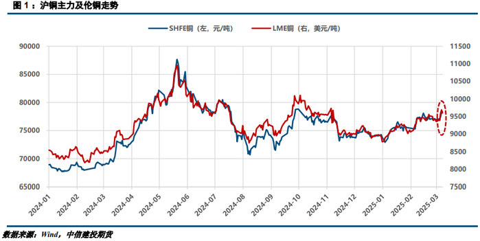 3月首周铜价走强,沪铜冲高回落,主力合约最高触及79280元后回落至7.85万元附近,周涨幅1.8%。LME铜触及9740美元后回调至9600美元附近,周涨幅2.6%。COMEX铜摸高4.85美元/磅后回调至4.7美元/磅,周涨幅3.6%。上周铜价的强势主要与特朗普国会提及对铜的关税威胁,刺激抢出口与囤货预期有关,加之欧洲财政刺激计划,复苏预期提振铜价走强。