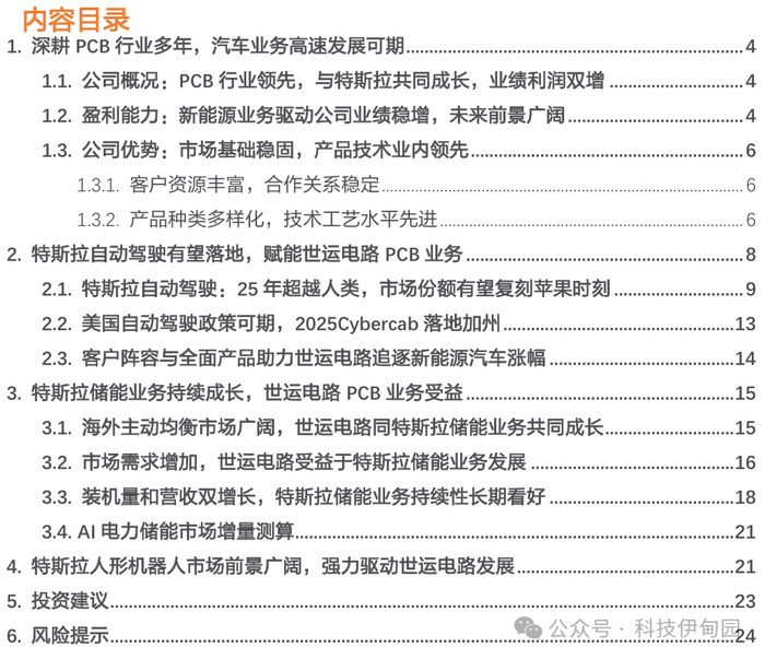 世运电路从2019年开始就与特斯拉开展非车业务的合作,在家庭储能、工业储能、超级充电桩、光伏产品、AI产品等方面都可以看见世运的身影。未来,世运电路继续将车载业务作为双方合作的核心,全力攻克自动驾驶、续航里程、充电速度等技术难点。非车业务有望实现多点开花,储能、光伏产品能够保持快速增长,积极配合客户研发调整AI产品、人形机器人产品。其中合作关系最为紧密的客户特斯拉,自 2019 年起便一直是世运电路最大的汽车终端客户,世运电路不仅为其提供新能源汽车“三电”领域的PCB产品,还基于技术同源性参与到特斯拉的光伏、储能,乃至超级计算机、人形机器人等新兴业务领域,也是参与特斯拉Dojo超算项目的上市公司合作伙伴,这也侧面印证了其技术实力。