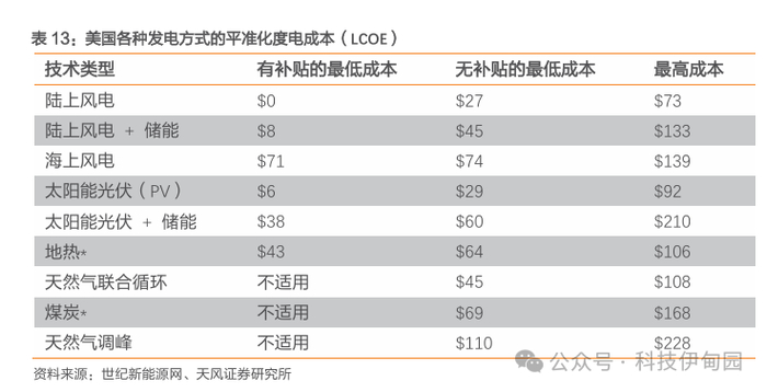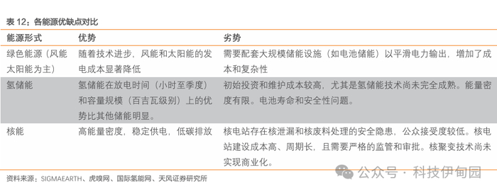 能源形式多种多样,而目前来看光伏+储能的技术最为成熟,因此AI用电缺口将带动光伏及其储能业务的增长。1)氢储能可以平滑电力输出,且灵活度高,但是技术层面未完全成熟且能量密度有限,还有寿命安全性问题,目前还在探索阶段。而核能能量密度高且稳定,本是最理想的数据中心供能来源,但由于其安全隐患公众接受度低,且建设成本高周期长,政府监管严厉,核聚变技术尚未商业化,核能商业化供能依然遥远。2)而绿色能源(风能、太阳能)+储能的形式既解决了绿色能源电力供应不稳定的难题,同时随着技术进步和商业化发展,成本在逐渐降低,应用前景广阔。