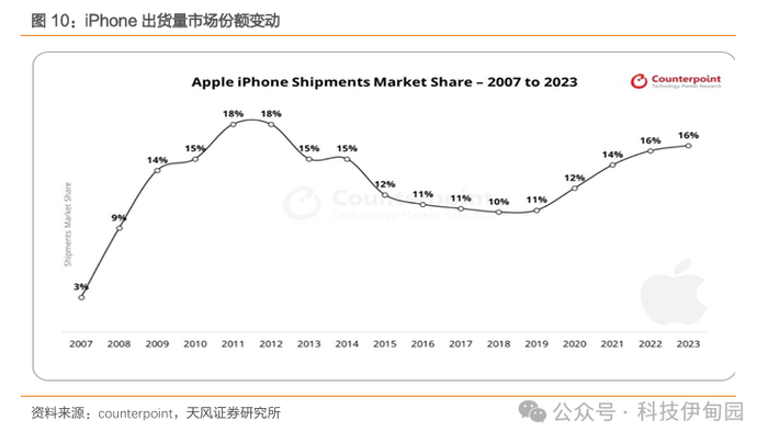苹果发展复盘,市占率从3%到16%的实现路径:2007年苹果推出第一代iPhone和iOS系统,使得手机行业产生了颠覆性的改变,推动全球智能手机行业变革,苹果公司畅享红利,其市场份额在这期间也从2007年的3%上升到了2015年的12%,此时iphone的销量来到了阶段性顶峰的2.32亿部,并在此后趋于下降直至21年再突破。2020年华为受到制裁后,苹果在智能手机市场份额逐步提高至16%。