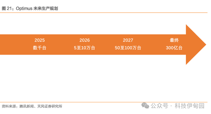 特斯拉公司制定了Optimus清晰的发展规划,实现从工业到民用领域的全面覆盖:1) 2025年聚焦北美工厂生产线应用场景导入,计划生产 1 万台,首批量产 2-3 千台,评估后优化供应链。2)2026 年C端初步启动销售与小批次交付,B端以租赁和大客户场景为突破口,同时扩建产线、扩充研发人员队伍。3)2027 年进一步扩张产能,启动对东南亚泰国以及北美墨西哥、奥斯汀和弗里蒙特等地的考察,以达成 50 万台量产扩张,后续按需扩产。4)B端聚焦高重复、高效率场景,在总装车间探索更多可替代场景。5)C 端面向社会生活场景,提升自由度与灵巧手操作能力,并持续推进整体减重,目标为一次充电使用数天,以提升产品在各应用场景下的实用性与续航能力。