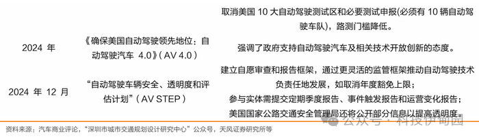 各州持续推进自动驾驶,2025Cybercab将落地加州:2011 年,内华达州率先通过立法,允许在公共道路上进行部分和完全自动驾驶汽车的研发测试,开启了美国自动驾驶立法进程。美国各州自动驾驶政策持续演进,其中加州一马当先,2023 年多项法案助力无人驾驶规模化发展、收紧商业宣传监管,且批准 Waymo 于旧金山、洛杉矶半岛扩大其无人驾驶出租车服务,开启商业化运营新篇。阿肯色州、伊利诺伊州、佛罗里达州等也积极行动,分别通过立法推动自动驾驶卡车编队行驶、界定车辆能力范围、强化基础设施建设等工作。截至 2024 年,根据美国自动驾驶车辆行业协会 (AVIA) 的数据显示,24 个州允许自动驾驶车辆测试或部署,12 个州仅允许测试,另有 15个州尚未制定相关立法。马斯克在2024年Q4电话会议中表示 2025年在加利福尼亚州和得克萨斯州推出面向公众的共享出行服务,并在年底向其他州扩散。并且,马斯克还透露特斯拉已在旧金山湾区为员工提供配备安全员的自动驾驶叫车服务。