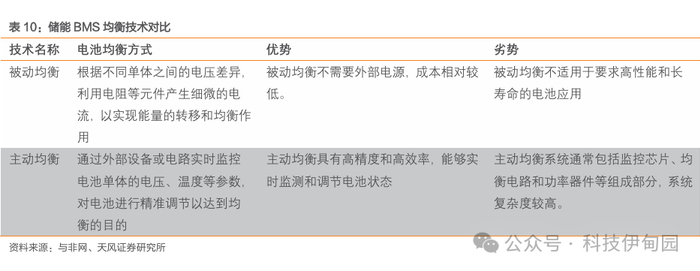 在电池管理系统(BMS)平衡电池组内各单体电池电荷状态的关键技术中,由于主动均衡能量利用率高,均衡速度快,但结构和控制算法复杂,成本高昂,主要运用在海外市场。1)主动均衡通过电量转移,运用变压器原理或电容等元件,将高电量电池的能量转移到低电量电池实现均衡。适用于对效率和性能要求较高的场合,如高端电动车、大型储能系统等。主被动均衡的详细对比请见下表。2)目前,由于成本价格等因素,EESA 2023年度数据统计,国内储能项目几乎均为被动均衡项目(98.4%)。在海外市场,大约70%的项目都采用了“主动均衡”。国内储能升级有很大潜力。