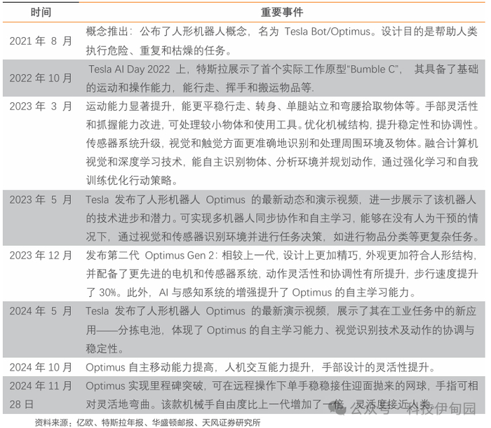 自 2021 年 8 月特斯拉公布人形机器人 Optimus 概念以来,随后的三年多时间里,在运动能力、手部灵活性、传感器系统及自主学习能力等方面不断取得进展。2022 年 10 月,首个实际工作原型 “Bumble C”推出,具备基础运动和操作能力。2023 年,Optimus 在运动能力、手部灵活性、机械结构、传感器系统以及智能技术融合等方面均有显著提升, 5 月展示了多机器人同步协作和自主学习等更复杂任务的能力。2023 年 12 月,第二代 Optimus Gen 2 发布,在设计、电机和传感器系统、动作灵活性、步行速度以及自主学习能力等方面都有所优化和提升。2024 年 5 月,Optimus 在工业任务中的分拣电池应用展示了其自主学习、视觉识别及动作协调稳定性。11 月 28 日,Optimus 实现里程碑突破,可在远程操作下单手稳稳接住迎面抛来的网球,手指灵活度接近人类。