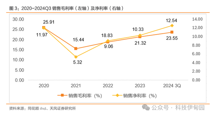 宏观经济发展受压的环境下,公司经营状况良好,未来盈利有望进一步增强。2024 年度公司实现营业收入 45.19 亿元,比上年同期增长1.96%;实现归属于上市公司股东的净利润 4.96 亿元,同比增加 14.17%。2024 年前三季度公司实现营业收入 36.75 亿元,同比增长 9.75%;归属于上市公司股东的净利润 4.83 亿元,同比增长 28.97%。2023年面对电子产品的整体需求疲软的环境,公司快速作出应对措施,保持营收稳定,同时公司持续加大客户维系力度,保障产品的质量及交期。2024年,公司营收回复增长态势,公司归属于上市公司股东的净利润同比大幅增长,得益于 2024 年上半年电子行业整体回暖,公司紧跟市场需求,积极开拓业务,订单充足,加上可转债募投项目产能释放加快,整体产能利用率提升,带动业绩增长。