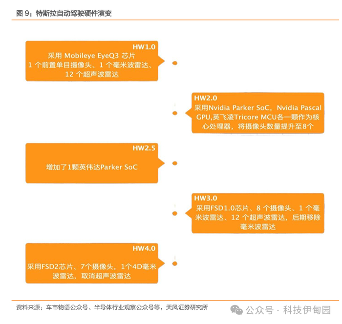 自研硬件从HW1.0到HW4.0持续迭代,高性能PCB未来可期:从HW1.0和HW2.0的外购芯片,到HW3.0和HW4.0的完全自主研发,特斯拉FSD硬件降低成本的同时,也提高了软硬件的适配程度,更好的支持其FSD创新算法与方案。2023年发布的HW4.0作为最新一代硬件,展现了极高的适配程度和创新性:搭载了两颗特斯拉自研的第二代FSD芯片,CPU内核从12个增至20个,总算力达到HW3.0的5倍,支持更复杂的神经网络运算。摄像头接口数量从9个变动至12个,像素从120万升级至500万,探测距离从250米大幅提升至424米。由于在恶劣天气条件下、摄像头的性能较差,传感器的具有感知缺陷,摄像头反应时间通常也较毫米波雷达长,往往需要几帧来识别物体的速度变化,此时就需要毫米波雷达根据发射频率和接收频率的差值测量距离、相对速度和方向,HW4.0重新引入高精度4D毫米波雷达弥补了纯视觉方案的风险。我们认为随着HW算力和传感器数量的提升,对高性能PCB的需求也将持续提升,是有利于上游PCB供应厂商的。