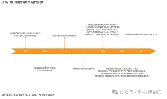 世运电路与特斯拉深度合作,已成为特斯拉核心供货商:世运电路与特斯拉的合作始于2012年,当时世运电路开始开发特斯拉作为其汽车终端客户。经过两年的审验,世运电路成为特斯拉的合格PCB供应商,并于2015年开始小批量供货。2017年,世运电路开始批量供货,销量稳步增加。2019年,世运电路对特斯拉的间接供货额同比增长约50%,特斯拉成为世运电路最大的汽车终端客户。同年,世运电路成功中标特斯拉SuperCharger(充电站)及Magapack(大规模能源存储)项目,并实现量产,标志着世运电路的产品已延伸至特斯拉的核心领域。2021年,世运电路与特斯拉签署了采购供应合约,以应对特斯拉德国柏林工厂和美国奥斯汀新工厂投产释放产能所需的配套供应。世运电路为特斯拉提供涵盖电动车三电领域(电机、电池、电控)的关键零部件产品,并进入光伏、储能等新产品供应链。