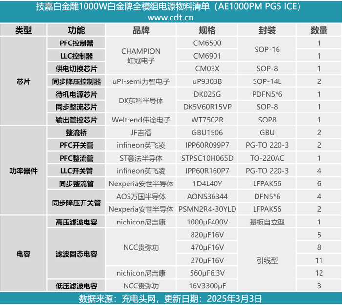 最后附上技嘉白金雕白金牌全模组电源的核心器件清单,方便大家查阅。