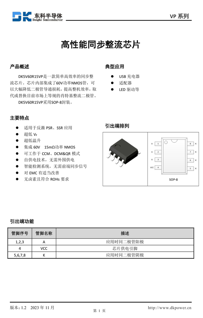 同步整流芯片来自东科半导体,型号DK5V60R15VP,是一款无外围的同步整流芯片,内置耐压60V,导阻15mΩ同步整流管。芯片具备自供电技术,可直接替代肖特基二极管,支持CCM,DCM和QR工作模式,无需外部元件,采用SOP-8封装。