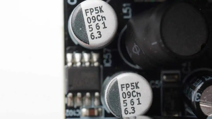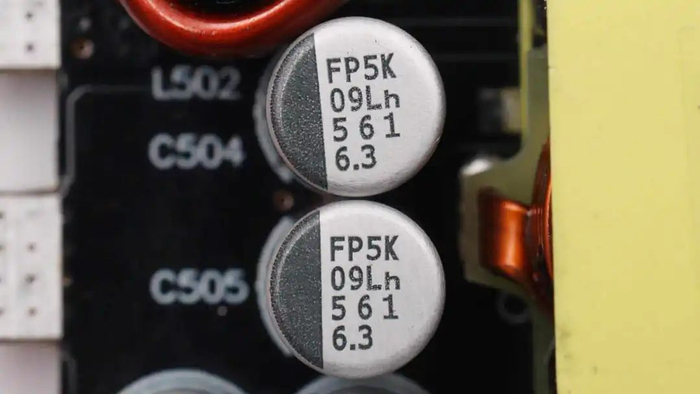 输出滤波电容来自尼吉康,为RL8系列固态电容,具备5000小时寿命保证,规格为560μF6.3V。