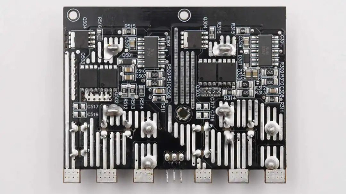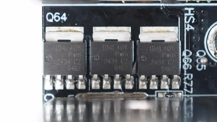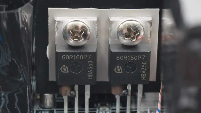 散热片下方设有六颗同步整流管,左右各三颗为一组。