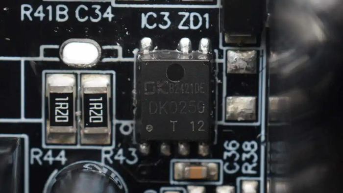 待机电源主控芯片来自东科,型号DK025G,是一颗内部集成了700V耐压,800mΩ导阻氮化镓开关管的准谐振反激开关电源芯片,芯片简化了反激开关电源的设计和制造,并具备高转换效率和高功率密度优势,芯片集成输出过压保护,VCC过压和欠压保护,过热保护,开环保护和输出过流保护,采用PDFN5*6封装。