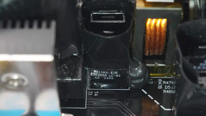 PCBA模块另一侧设有散热片,散热片设有两颗PFC开关管和PFC整流管。NTC热敏电阻外套热缩管绝缘保护,左侧设有待机电源变压器和滤波电容。