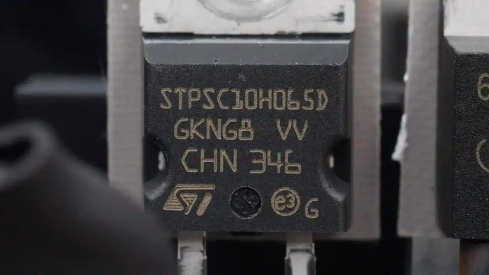 PFC整流管来自意法半导体,型号STPSC10H065D,为碳化硅二极管,规格为650V 10A,具备高浪涌电流能力,采用TO-220AC封装。