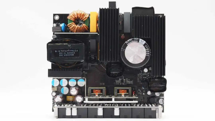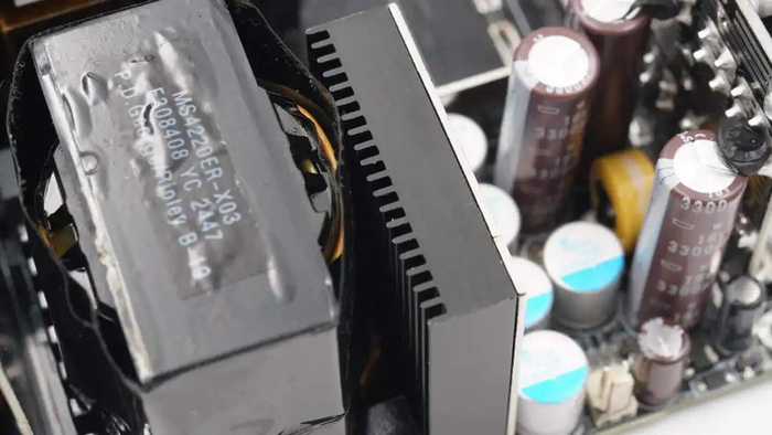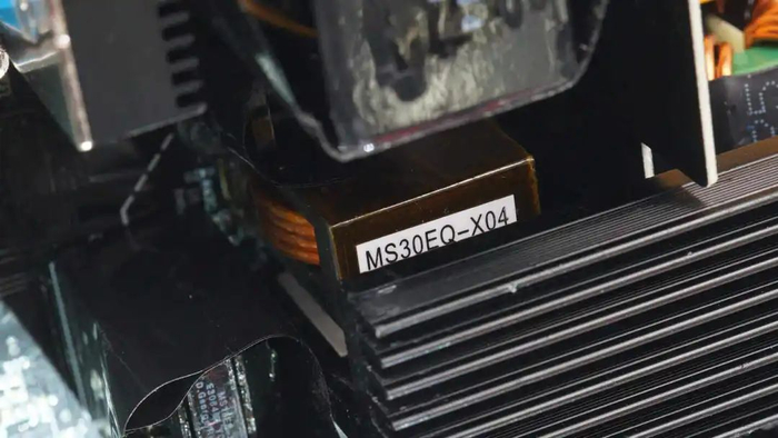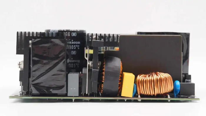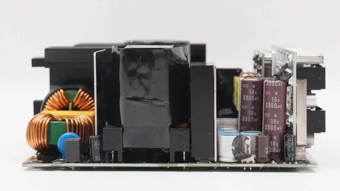 左侧中间位置为开关变压器,下方为整流管散热片与输出滤波电容。中间位置为同步降压小板,右侧为待机电源变压器。底部为输出模组插座小板。