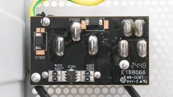 电源输入端设有小板,焊接电源插座,电源开关,贴片Y电容和X2电容放电芯片。