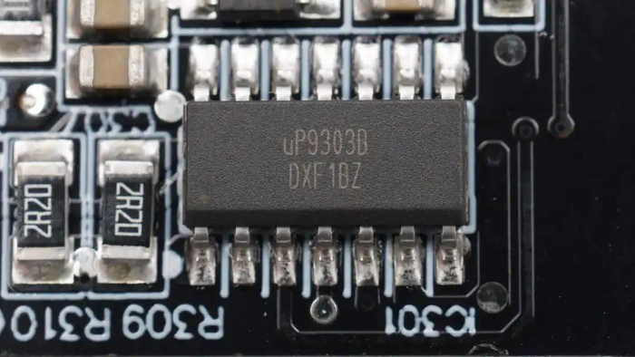 同步降压控制器来自力智,型号uP9303B,芯片支持12V输入电压,最高输出电流30A。芯片支持无损过电流保护功能,具备过压和欠压保护,采用SOP-14L封装。