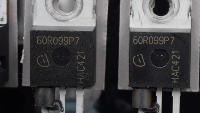 两颗PFC开关管来自英飞凌,型号IPP60R099P7,NMOS,耐压650V,导阻99mΩ,采用PG-TO 220-3封装。