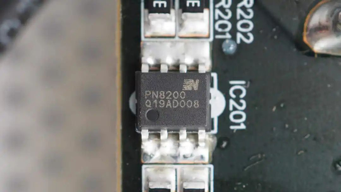 X电容放电芯片来自芯朋,型号PN8200,是一款双端子的X电容专用放电芯片,内部集成1000V耐压MOS管,芯片为自偏置,当断开交流电源后,芯片通过放电电阻为X电容放电,采用SOP8封装。