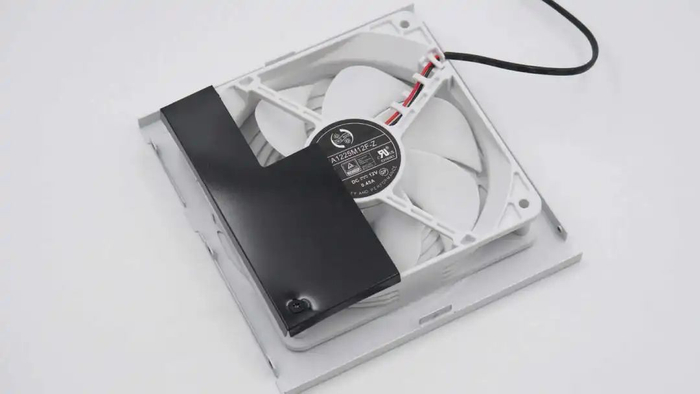 散热风扇来自鸿华,型号HA1225M12F-Z,规格为12V0.45A,为12CM风扇。