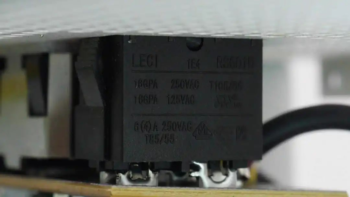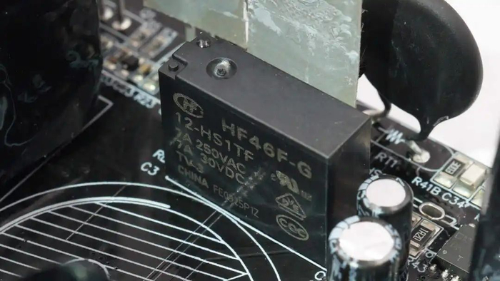 继电器来自宏发,型号HF46F-G,线圈电压为12V,内置一组常开触点,触点容量为10A,用于延时短路NTC热敏电阻,降低损耗。