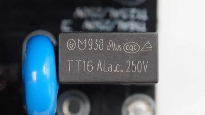 输入端保险丝来自贝特电子,出料号938,为慢熔断型,规格为16A 250V。