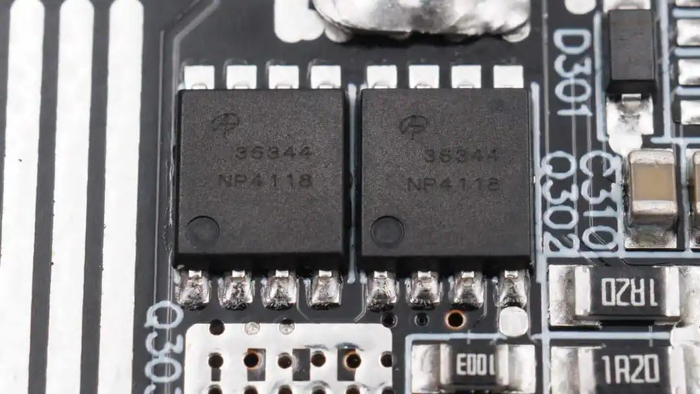 两颗同步降压下管来自万国半导体,型号AONS36344,NMOS,耐压30V,导阻2.73mΩ,采用DFN5*6封装,使用两颗并联,适用于电脑和服务器以及负载点中的DC/DC转换器应用。