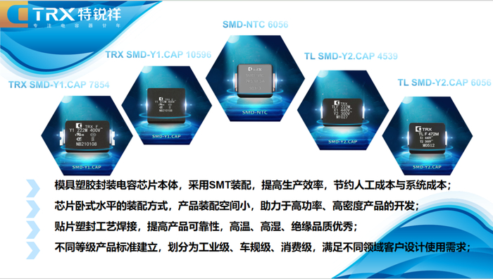 特锐祥专注于被动元器件的研发、生产及销售,注册资本1亿元。旗下产品包括:贴片式Y电容、插件式Y电容,贴片式中高压直流电容、以及贴片式NTC。TRX将致力于陶瓷材料的研究,以拓展更多品类的应用,为客户提供更多的解决方案。