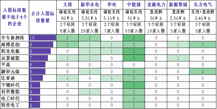 共计有160家单位参与了针对储能系统、EPC和直流侧的集采投标,共有82家企业有所收获。在集采入围方面,入围标段数不低于4个的企业一共有11家。中车株洲所、海博思创、阳光电源分别入围了10个、9个和8个标段,位列集采入围的前三名。