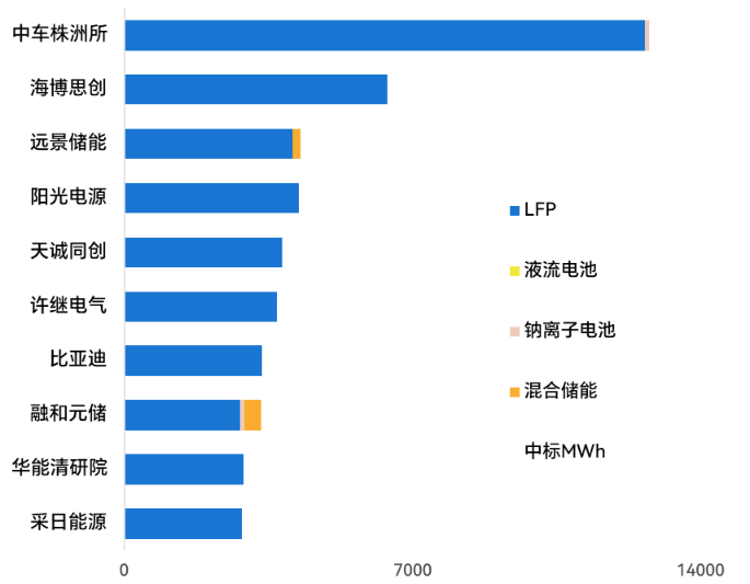 在磷酸铁锂储能系统供应商中,中标规模超过1GWh的企业共有23家:中车株洲所以中标93个项目总规模12.8GWh名列第一,不论是中标项目数量还是中标总规模均遥遥领先。海博思创位居第二位,中标规模超过了6GWh。远景储能、阳光电源、金风零碳、许继电气位居第3-6位,差距近在伯仲之间。融和元储、华能清研院、采日能源位居第7-10位。